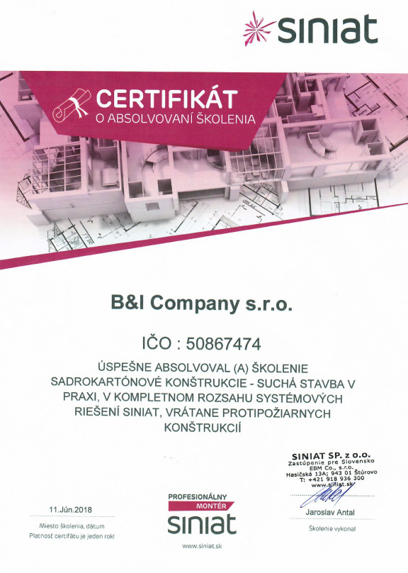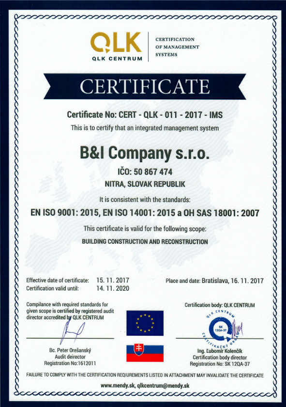 B&I Company s.r.o. je stavebná spoločnosť, so sídlom v Nitre, ktorá má vo svojej činnosti komplexnú ponuku stavebných služieb s profesionálnym prístupom.